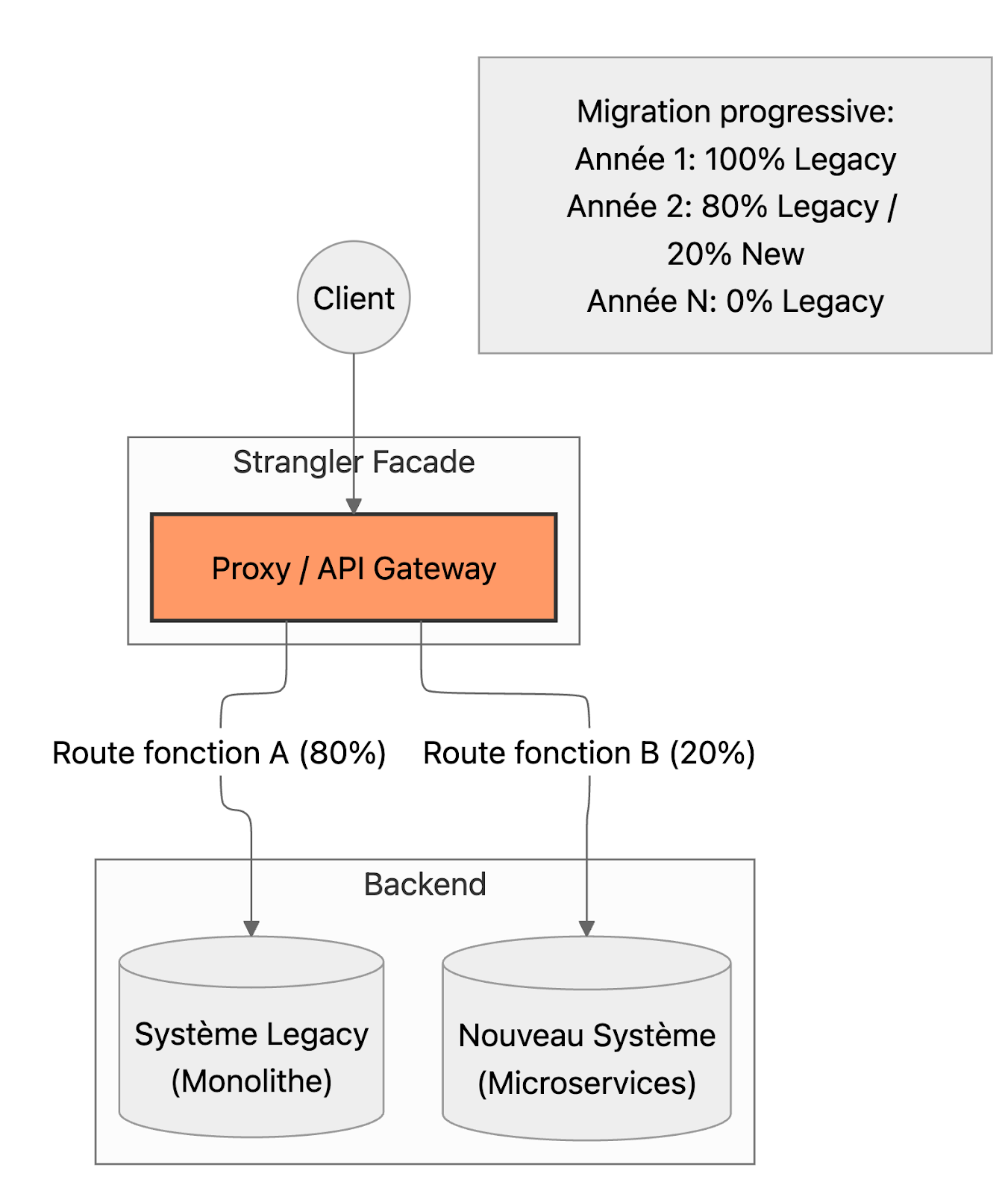 - Conseil : Mettez en place une couche de routage centralisée et intelligente au début du processus. Cette façade doit pouvoir rediriger les appels vers l'Ancien Système pour les fonctionnalités non migrées, et vers le Nouveau Service pour les fonctionnalités migrées, de manière transparente pour le client.