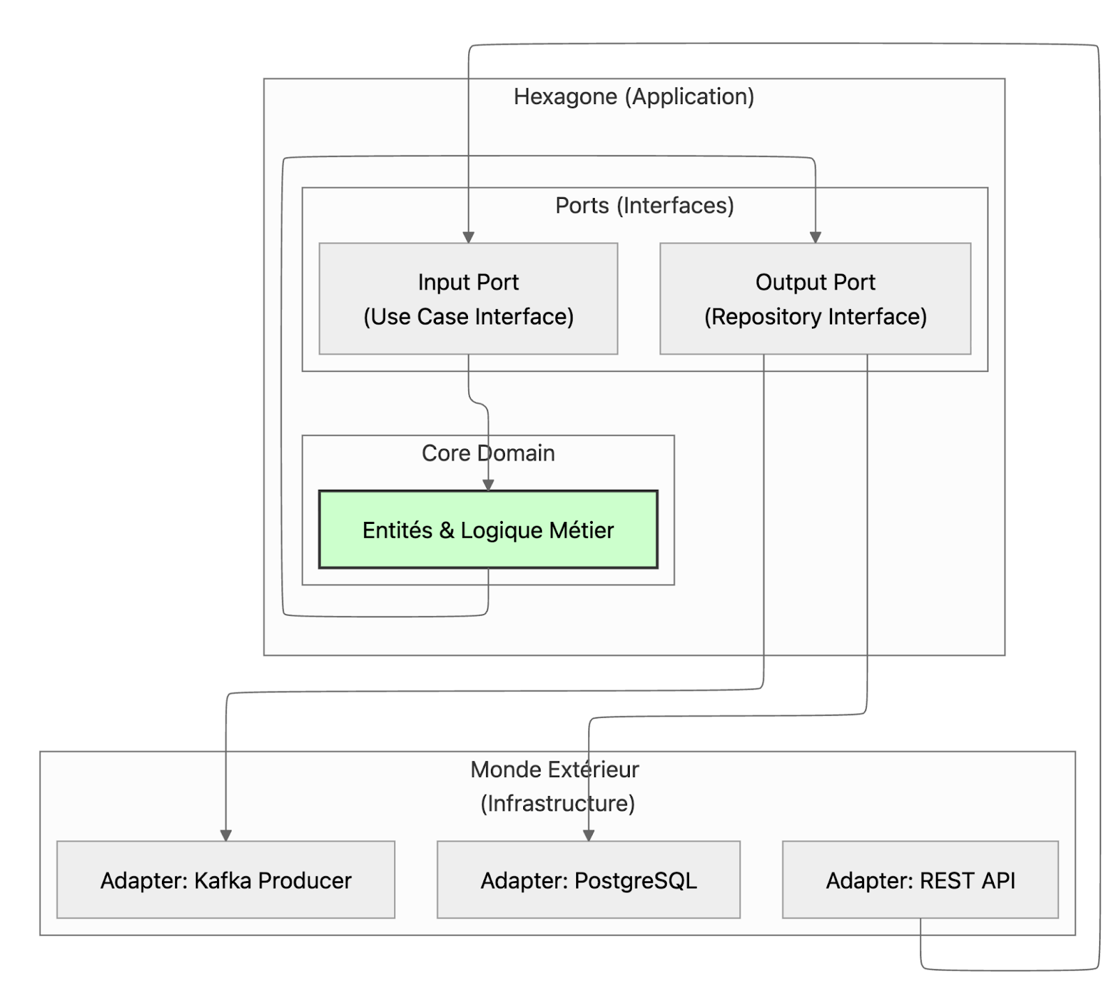 - Les adapters : implémentations concrètes (DB, API, message broker)