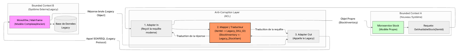 - Isolation du Domaine : L'ACL est une couche de traduction qui agit comme une barrière entre votre Domaine Modélisé (votre nouveau système) et les modèles externes (typiquement des systèmes legacy ou des services tiers).